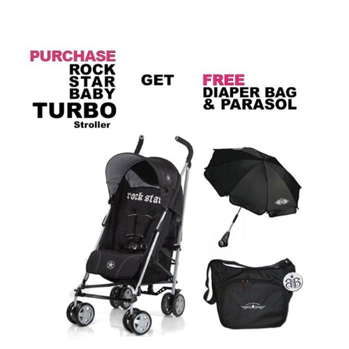 Rock Star Baby Turbo Stroller with FREE diaper bag and parasol.For a limited time, purchase a Rock Star Baby Turbo Stroller and receive a FREE diaper bag and parasol (while supplies last). Huge Savings!The latest hit from Tico Torres is the new Rock Star Baby Turbo stroller.The Rock Star Baby Turbo is the perfect stroller for families that don't want to sacrifice comfort and style for easy portability. Featuring an adjustable footrest and a multi-position backrest with a full recline and extra c